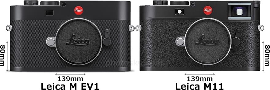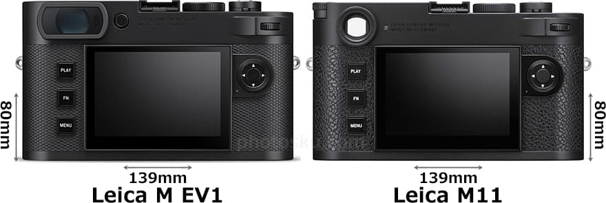 - 「ライカM11」はレンジファインダー式光学ファインダーを搭載していましたが、「ライカM EV1」は電子ビューファインダー(EVF)になりました。「ライカM EV1」は被写界深度の浅い大口径レンズでも快適なマニュアルフォーカスが可能です。また、「ライカM EV1」はサイズそのまま(厳密にはわずかに異なります)に重量が約45~155g軽量化しました。バッテリー持続時間は「ライカM11」のほうが大きく優れています。