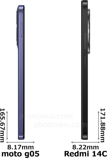 - 「moto g05」は6.7インチ(720×1612)のディスプレイに対し、「Redmi 14C」はより大きな6.88インチ(720×1640)です。「moto g05」はステレオスピーカーですが、「Redmi 14C」はモノラルスピーカーに対応します。