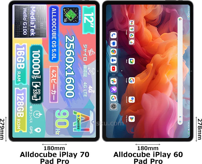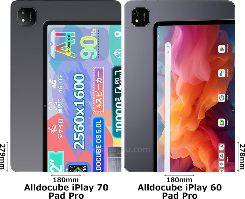 オールドキューブ「Alldocube iPlay 70 Pad Pro (オールドキューブ・アイプレイ・セブンティー・パッド・プロ)」と「Alldocube iPlay 60 Pad Pro (オールドキューブ・アイプレイ・シックスティー・パッド・プロ)」の違いを比較しました。