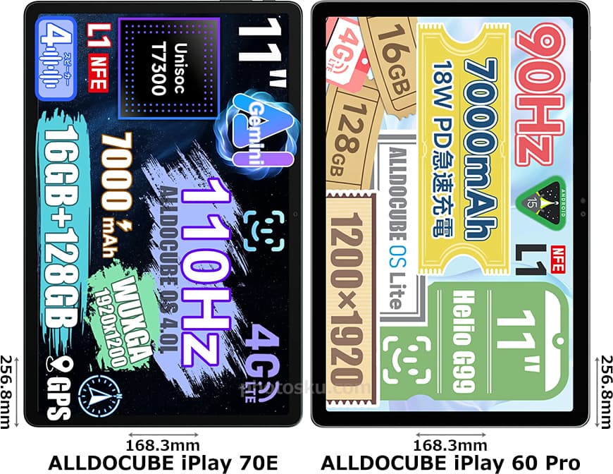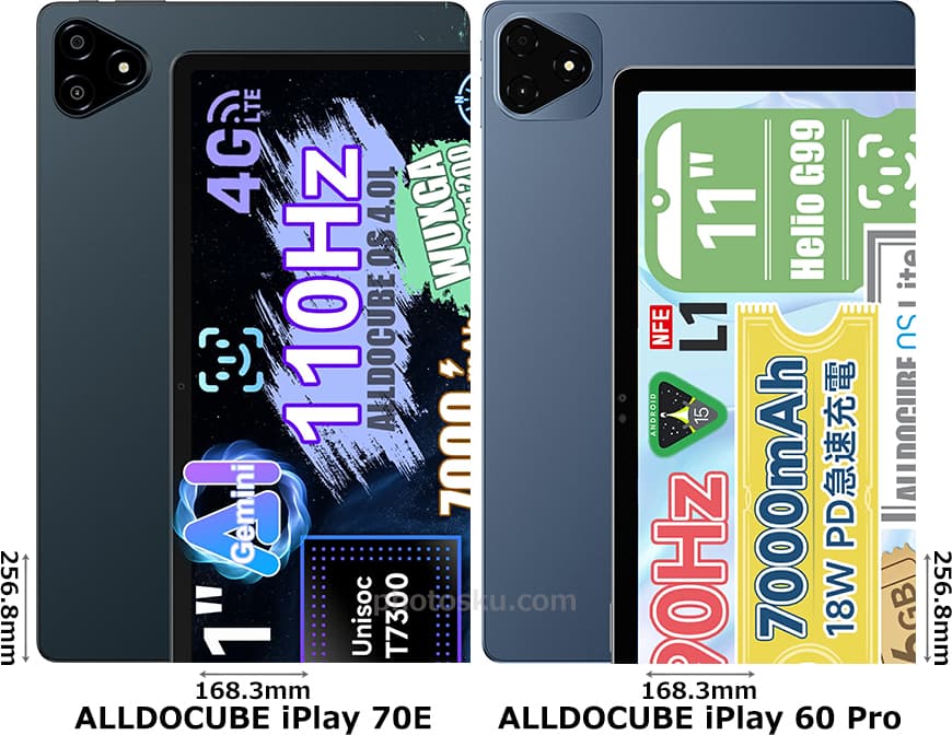 「ALLDOCUBE iPlay 70E (オールドキューブ・アイ・プレイ・セブンティー・イー)」と「ALLDOCUBE iPlay 60 Pro (オールドキューブ・アイ・プレイ・シックスティー・プロ)」のスペック違いを比較